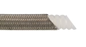 European manufactured low profile helically Convoluted PTFE / Teflon hose with AISI 304 braid that can be crimped without de-convoluting.